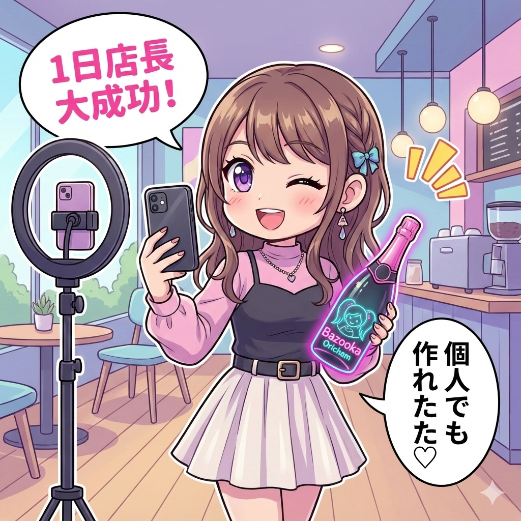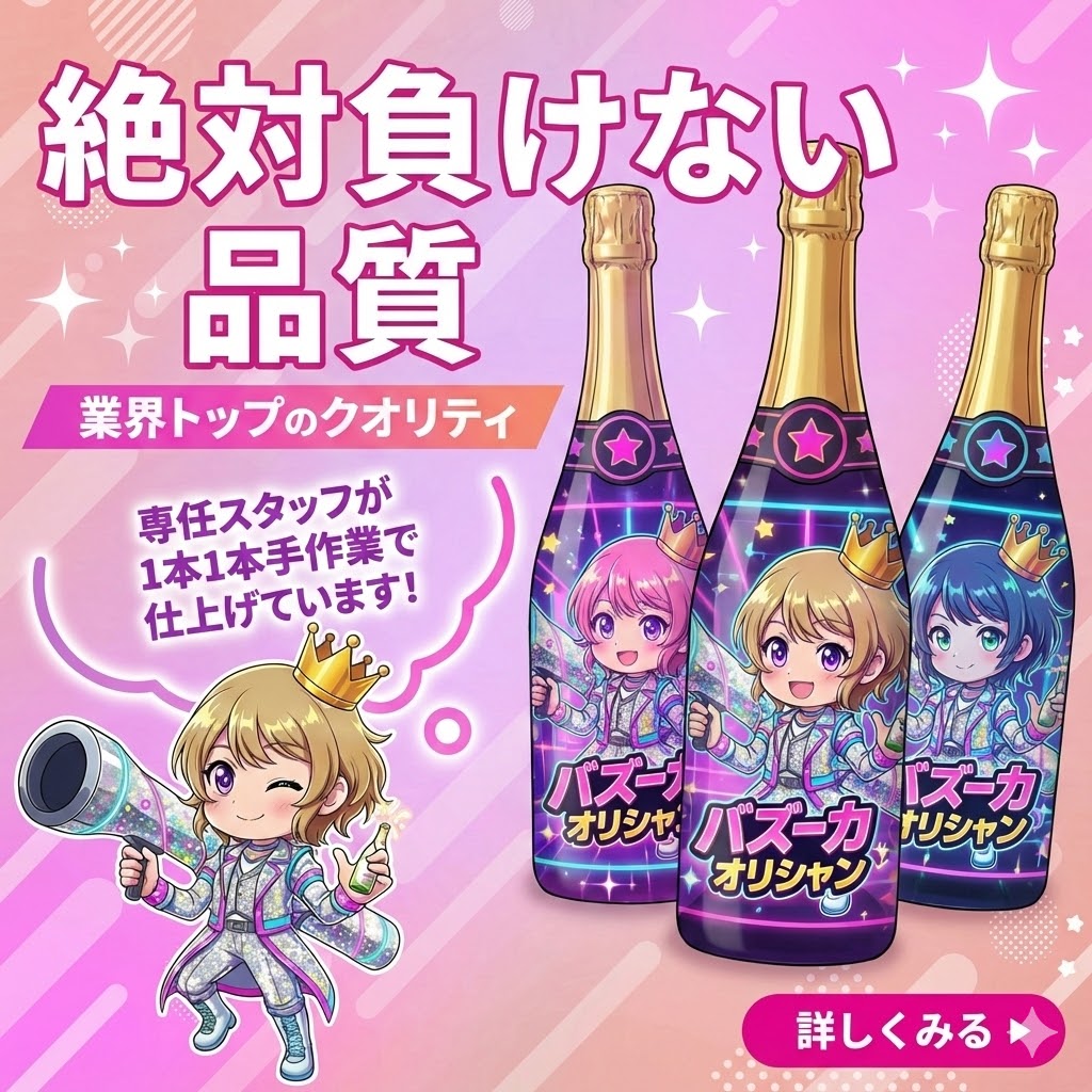 お店を卒業して、レンタルスペースでの単独イベント用に注文しました。個人だと業者に相手にされないか不安だったけど、バズーカさんは親身に相談に乗ってくれて…! ファンの方にも「クオリティ高すぎ!」って褒められて、用意したボトルは即完売♡ 次回も絶対お願いします!