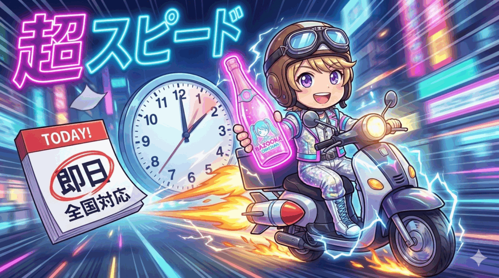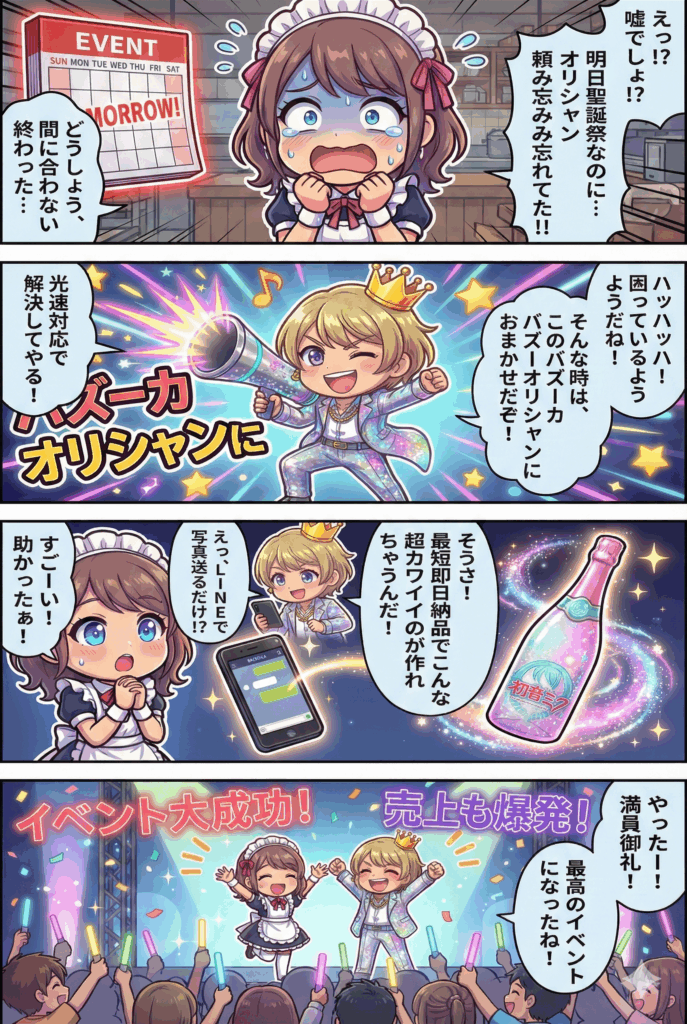 【池袋】大型コンカフェ店長 K様イベント3日前に他社でトラブルがあり、急遽バズーカさんに泣きつきました。「任せてください!」とLINEで即レスいただき、翌日には発送完了。届いたボトルのクオリティも完璧で、キャストも大喜び。あのスピード感は本当に救世主です。これからは全イベントお願いします!