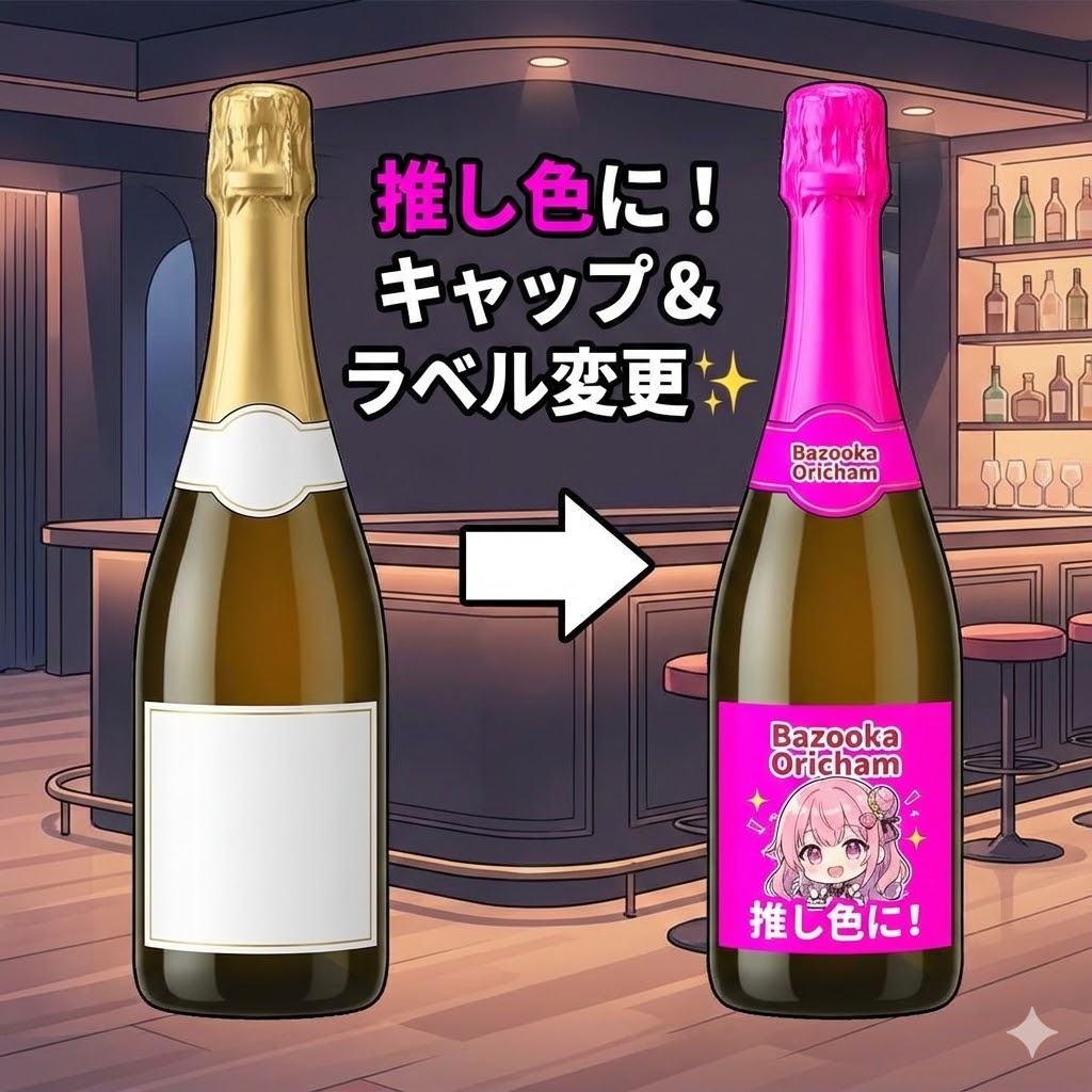 フルラッピングだけでなく、キャップシールやネックラベルなど部分的な推し色カスタマイズも対応。低コストでボトルに統一感を出せます。